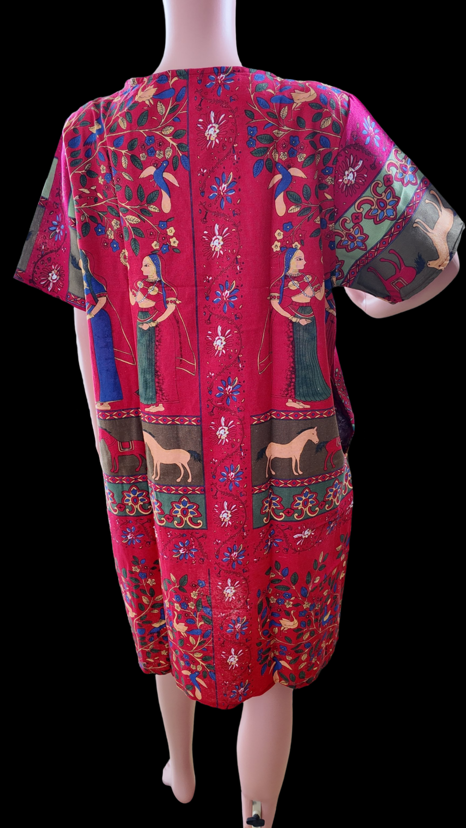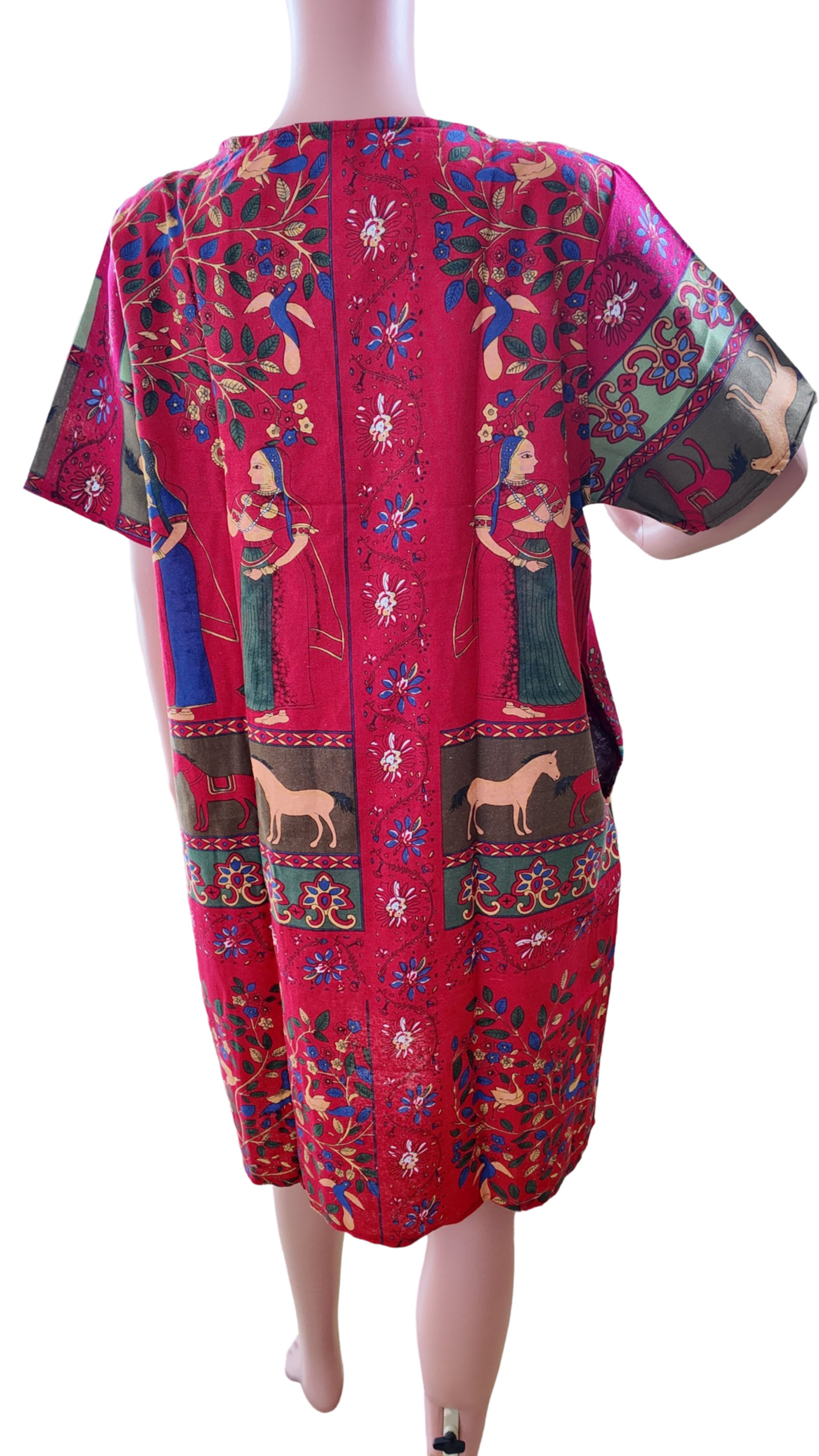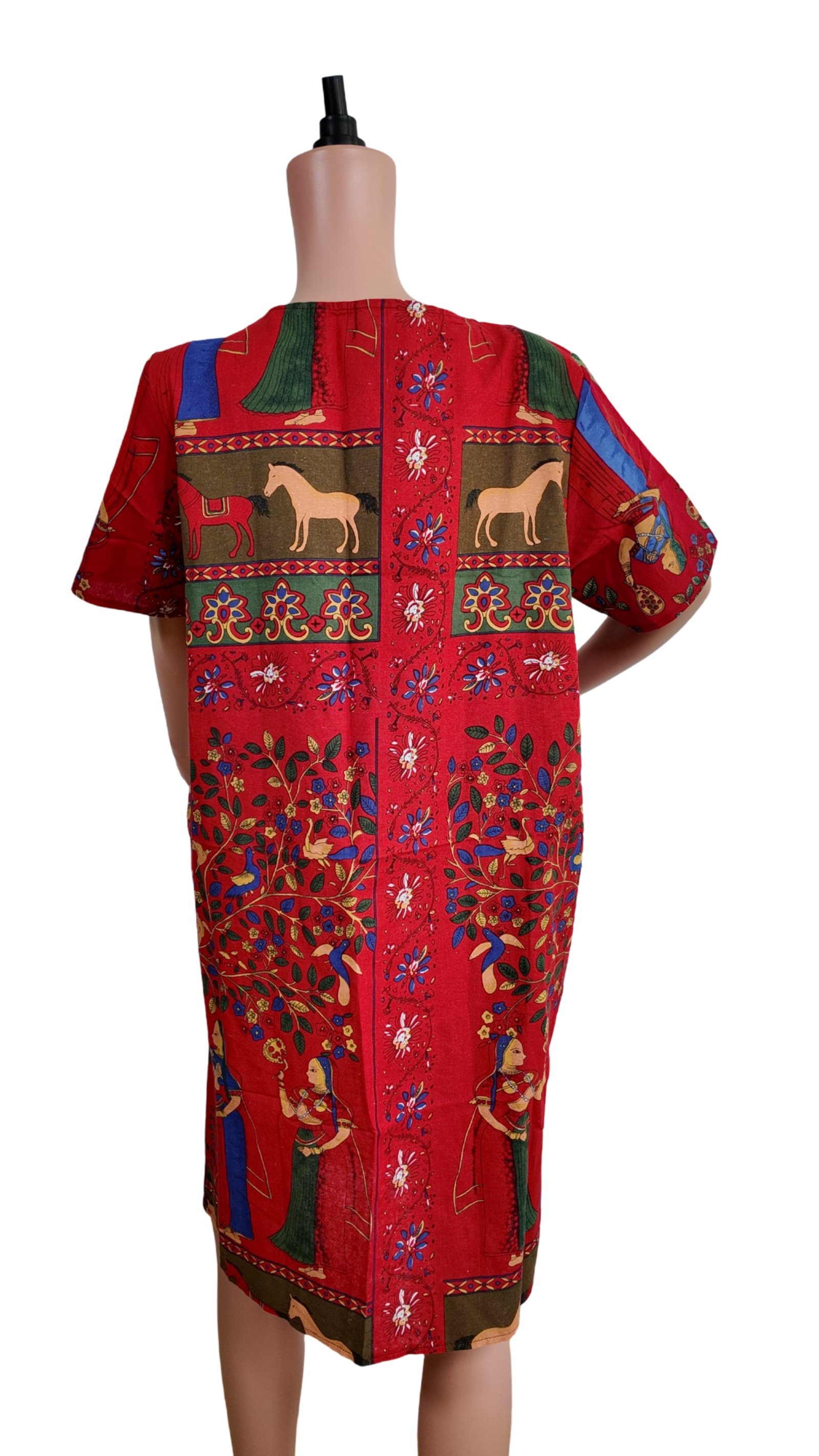 Boho colourful cotton dress with short sleeves, knee-length midi dress, customized plus-size straight cut. Suitable for casual and beachwear, perfect for daily wear.