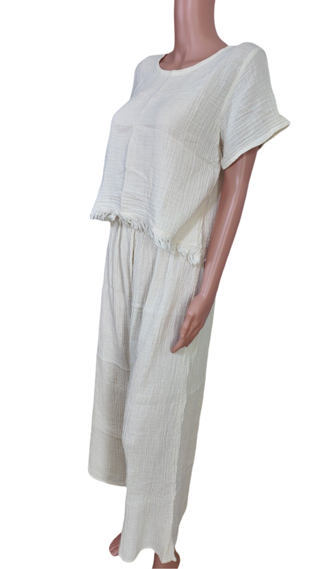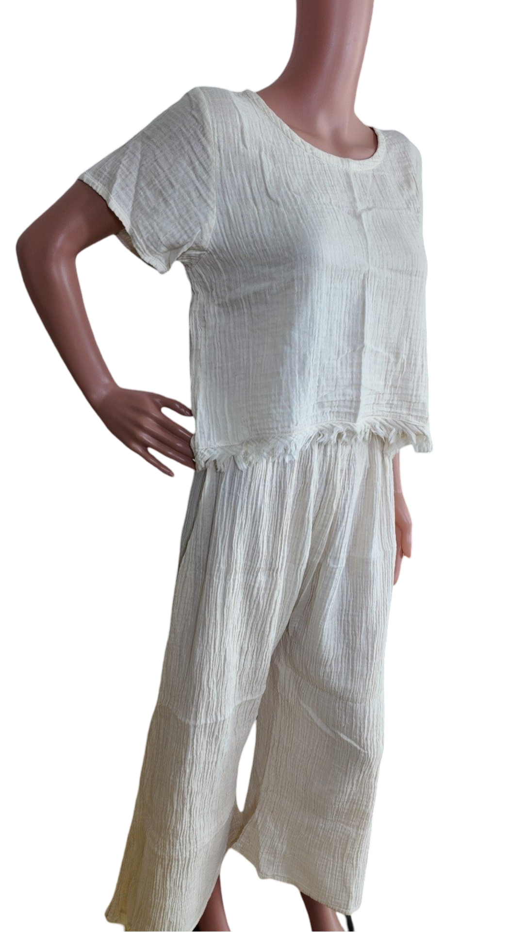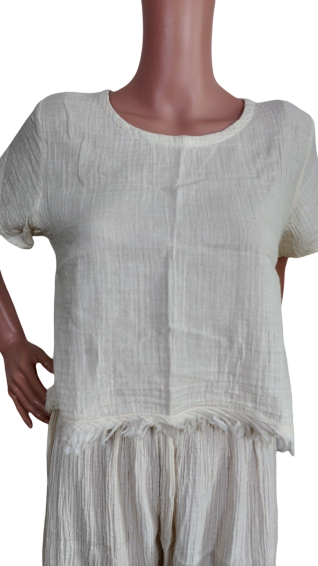 Sleeveless short jacket with button, front open, made from hemp cotton for easy wear. Classy styling and feels cooler when worn.