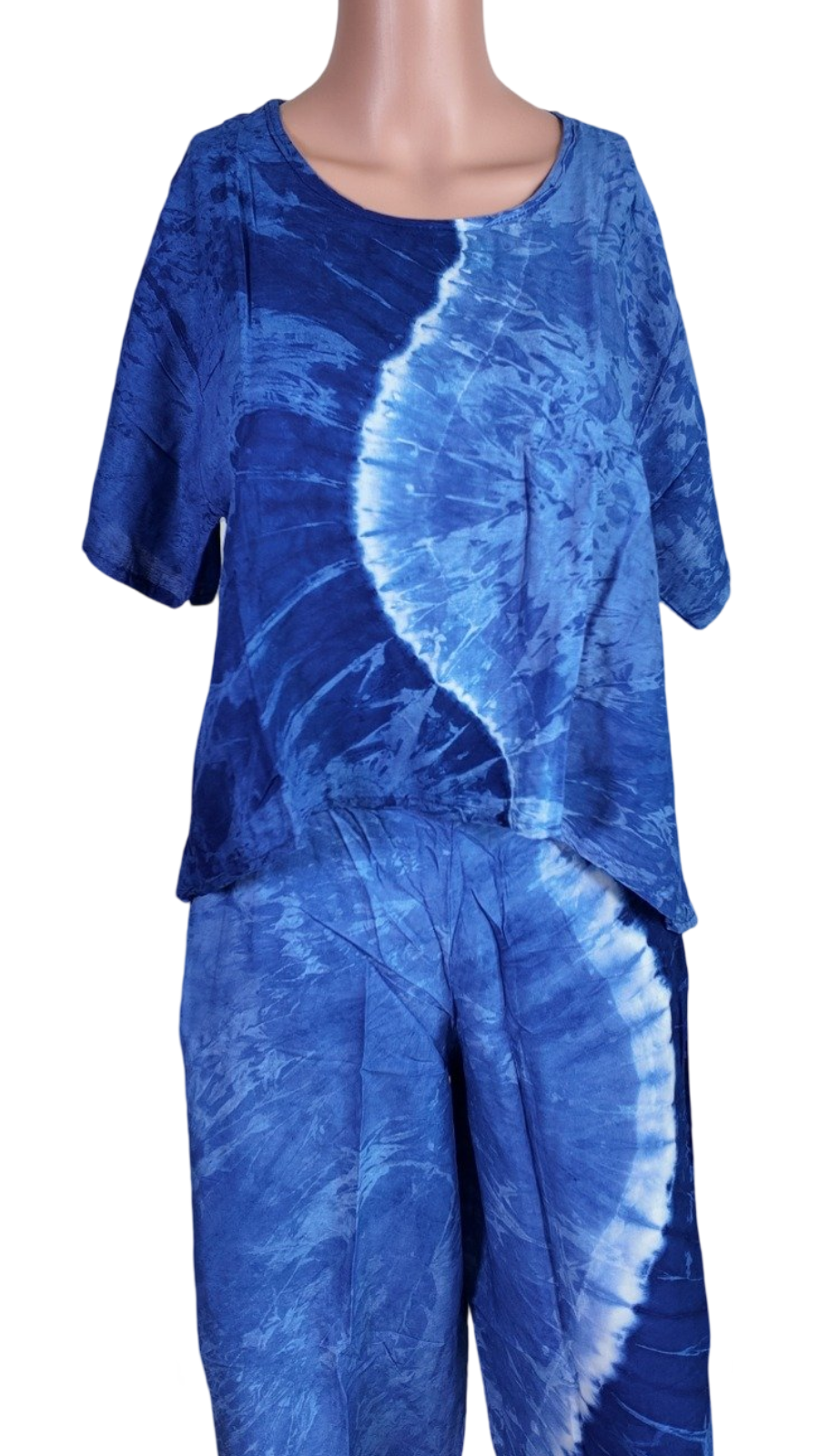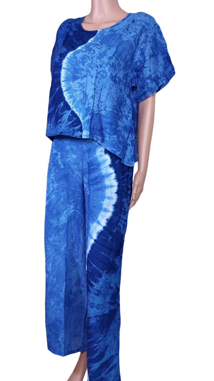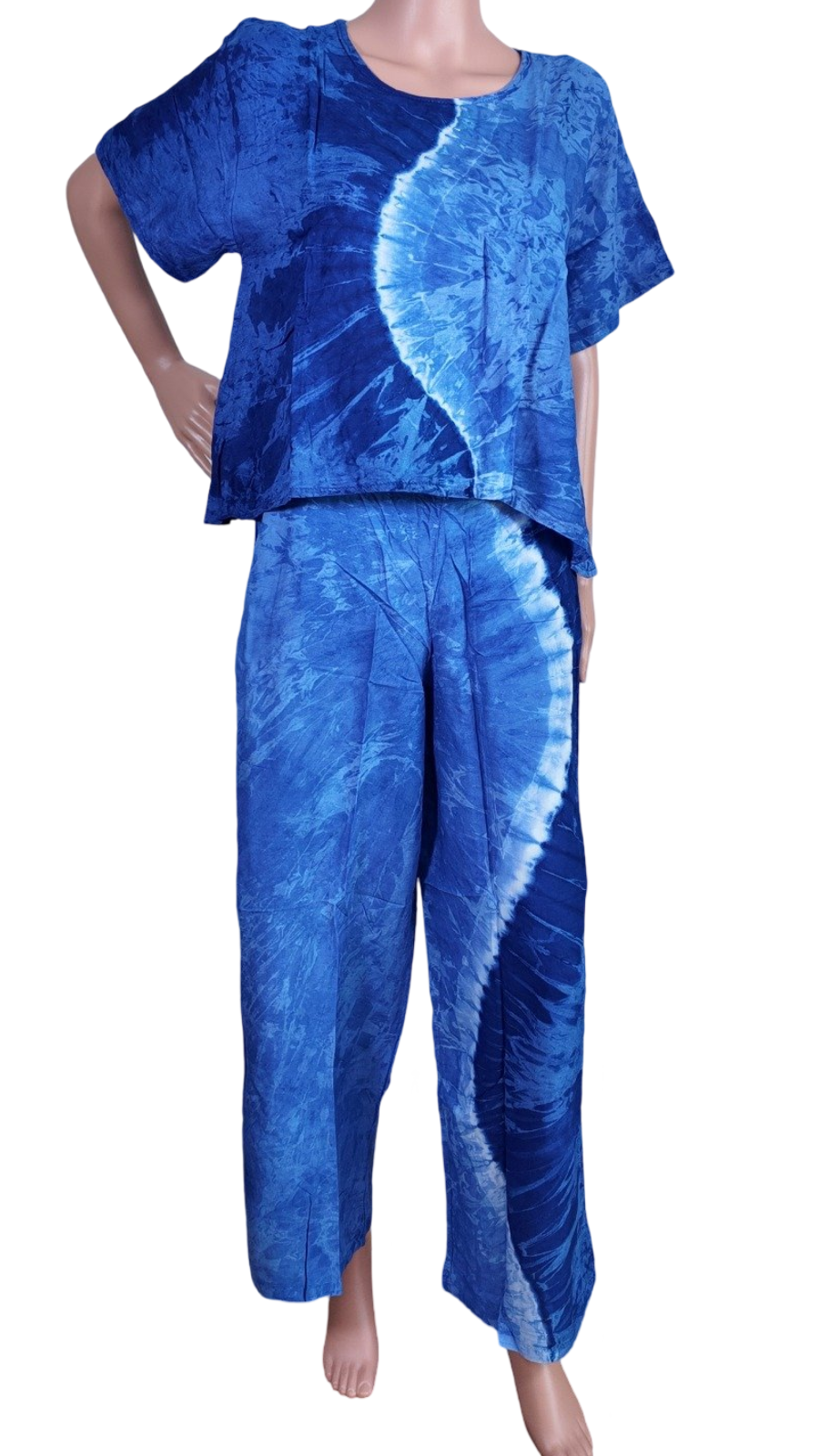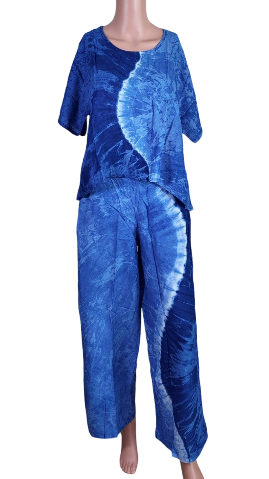 Tie-dye cotton linen co-ord set. Features wide straight leg and beautiful tie-dye patterns. Lightweight and ideal for summer or layering on cooler days. Stay stylish and comfortable with the vibrant tie-dye design.
